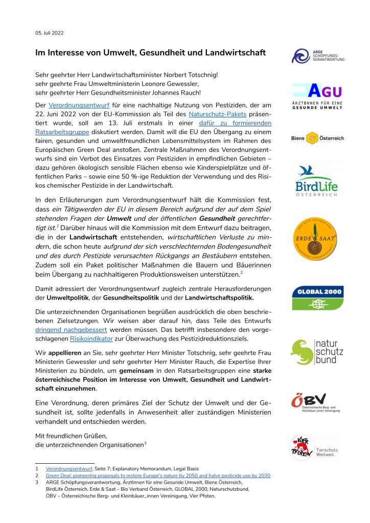 Am 13. Juli formiert sich erstmals die Ratsarbeitsgruppe zur Sustainalble Use Regulation, in der es vor allem um das Erreichen des 50%-Pestizidreduktionsziels geht. Mit dem Offenen Brief wollen wir BMK, BMG und BMLRT auffordern sich gemeinsam in dieser Ratsarbeitsgruppe einzubringen (was auch andere Mitgliedsstaaten machen). Schließlich sind die primären Ziele des Gesetzesentwurfs der Schutz der Umwelt und der Gesundheit. Da jeder Mitgliedsstaat 4 Delegierte entsenden kann, sollte das auch möglich sein. Aufgrund der destruktiven Rolle, die Österreich in bisherigen Ratssitzugen unter alleiniger Federführung des BMLRT spielte, halten wir es für dringend gebotem.