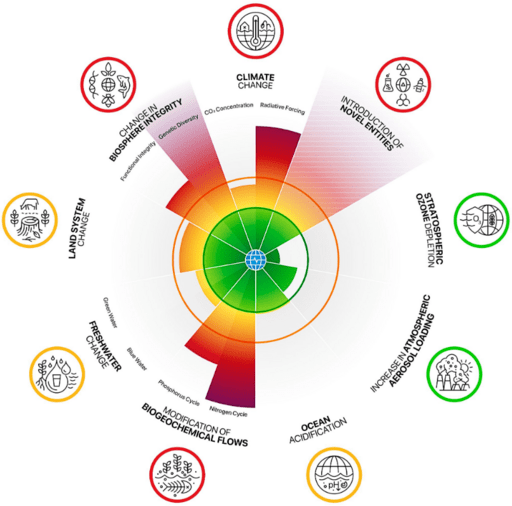 Zu Beginn führte uns Sigrid Stagl in das Thema der planetaren Grenzen ein und zeigte auf, wie die Überschreitung ökologischer Belastungsgrenzen zu gesellschaftlichen Herausforderungen führt. Laut dem Planetary Health Check 2025 (Bildquelle: Planetary Health Check 2025 – A Scientific Assessment of the State of the Planet) sind inzwischen sieben von neun sogenannten planetaren Belastungsgrenzen überschritten. Im Bereich Biodiversität, Klimawandel, Landnutzung, Wasserkreislauf, Stickstoff- & Phosphorkreislauf, Eingriffe durch neuartige Stoffe, Ozeanversauerung befinden wir uns außerhalb des sicheren Rahmens. Doch es gibt Handlungsmöglichkeiten wie man an der Erholung des Ozonlochs sieht.