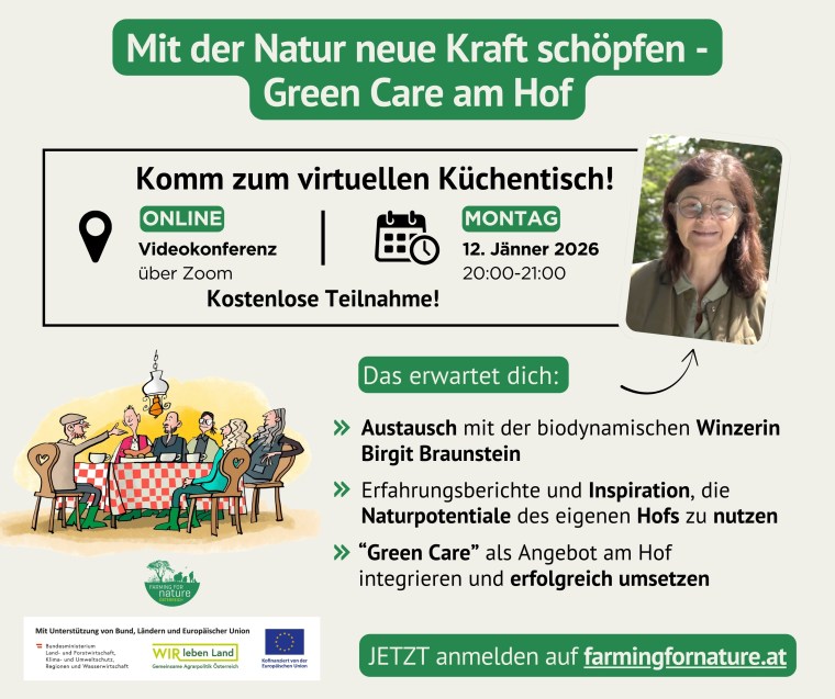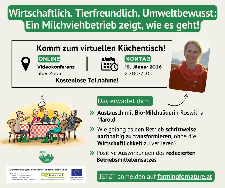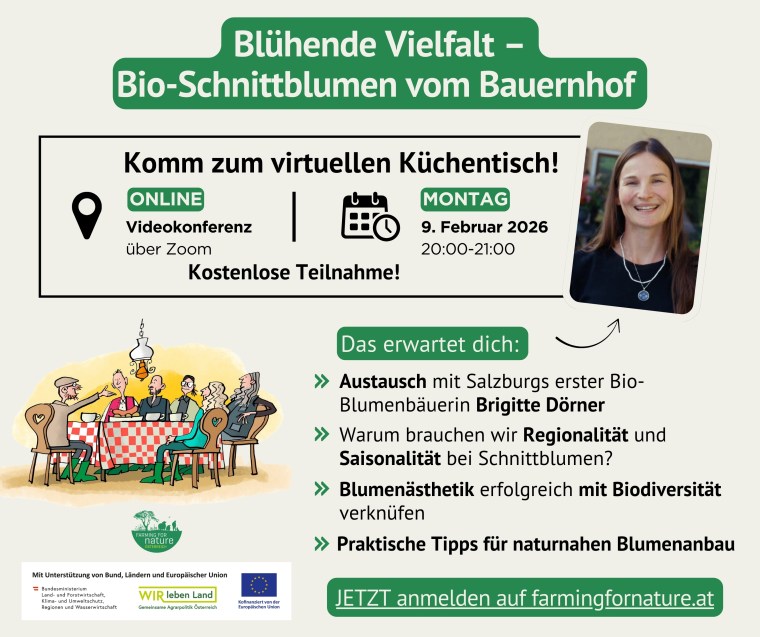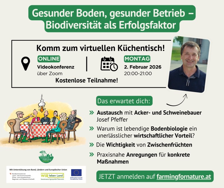 Im Jänner und Februar könnt ihr über Zoom die Biodiversitätsbotschafter 2025 online kennenlernen. In gemütlicher Runde sitzt du gemeinsam mit den „Farming for Nature“-Bäuerinnen und -Bauern am virtuellen Küchentisch und erfährst, was sie für die Förderung der Artenvielfalt auf ihrem Betrieb konkret machen. Und warum sie das alles eigentlich machen.
