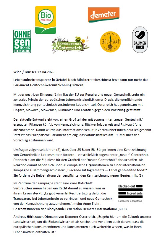 Am Mittwoch, dem 22. April 2026, veröffentlicht Demeter Österreich eine PR-Meldung, welche auch von Seiten Erde & Saat unterstützt wird und in der Wolfgang Plaimer folgende Forderung formuliert.